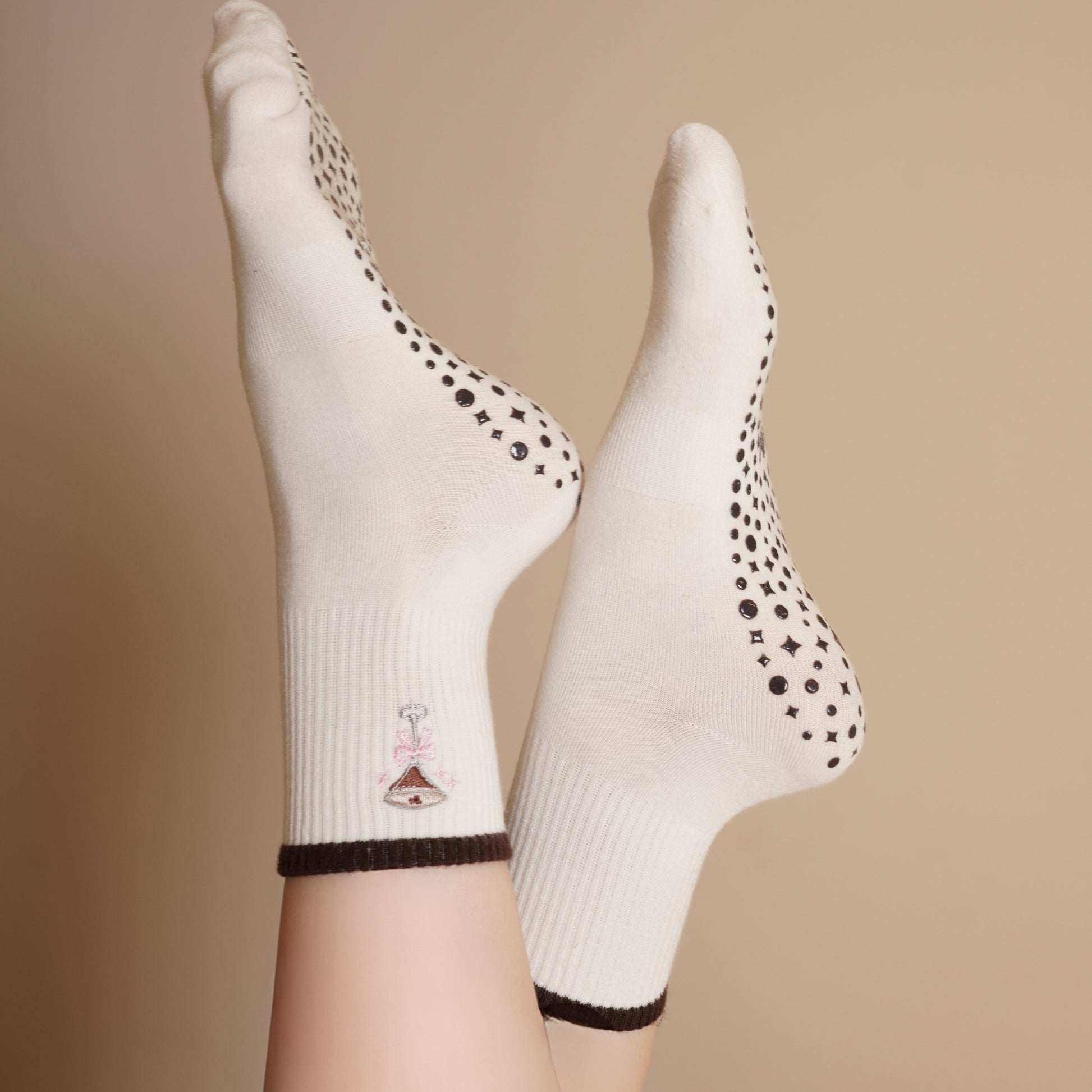 Espresso Martini Grip Socks with Pink Bow – Chic and playful grip socks with a espresso martini embroidery, finished with a delicate pink bow. Designed for both comfort and style, they feature soft, breathable fabric and non-slip grips for secure, confident movement during workouts