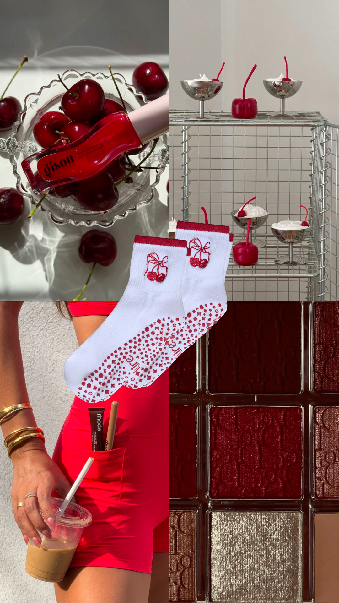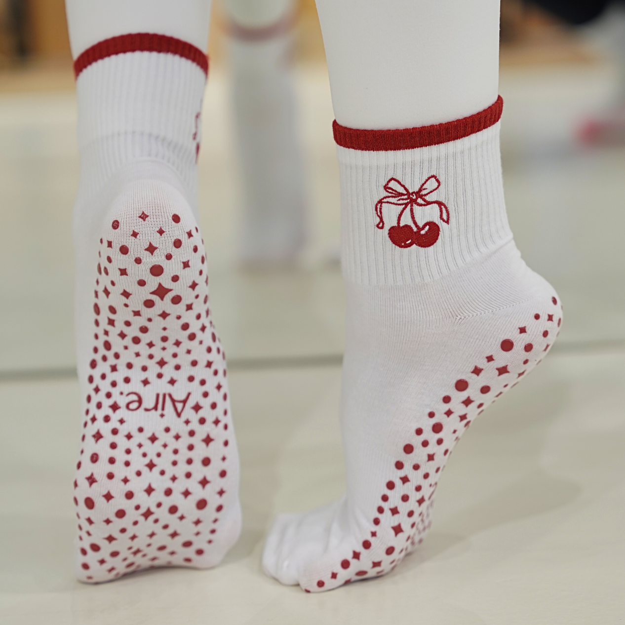 Red grip socks with cherry embroidery.